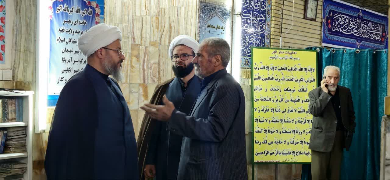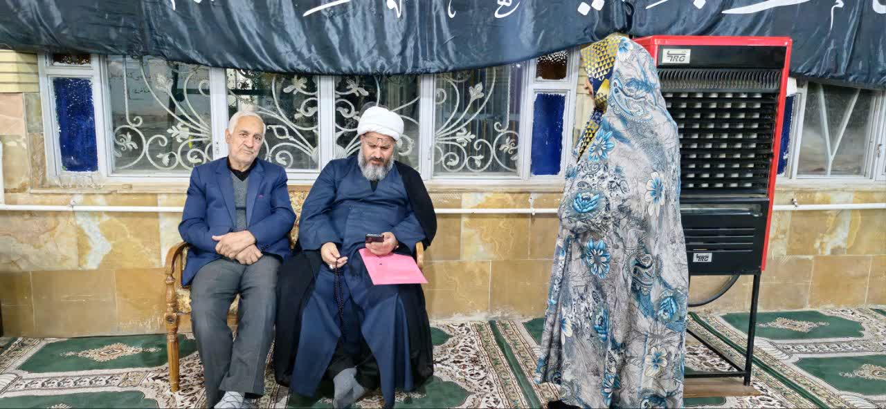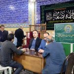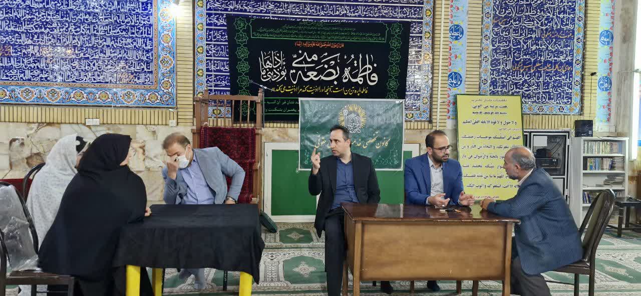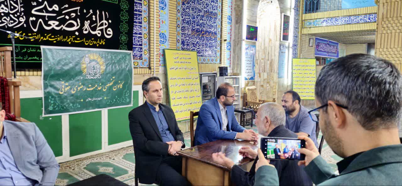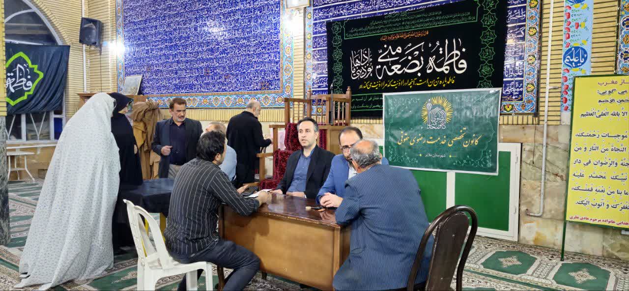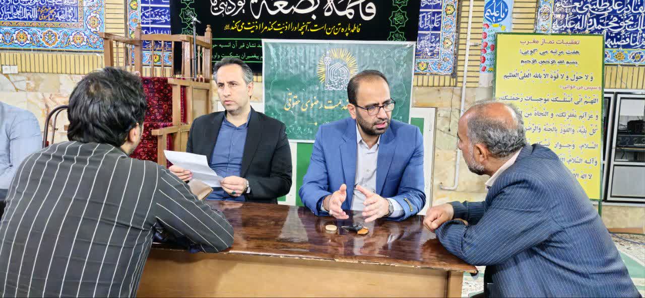 میز خدمت فرهنگی رضوی ،دایره حقوقی باحضور اقای فرجی ر ییس دادگستری و همراهان و ..با اقاشمس و حاج اقا صحرا نورد از کانون رضوی سید الشهداء (ع)شهرستان در مسجد اعظم ملایر واقع در بلوار مدرس ملایر